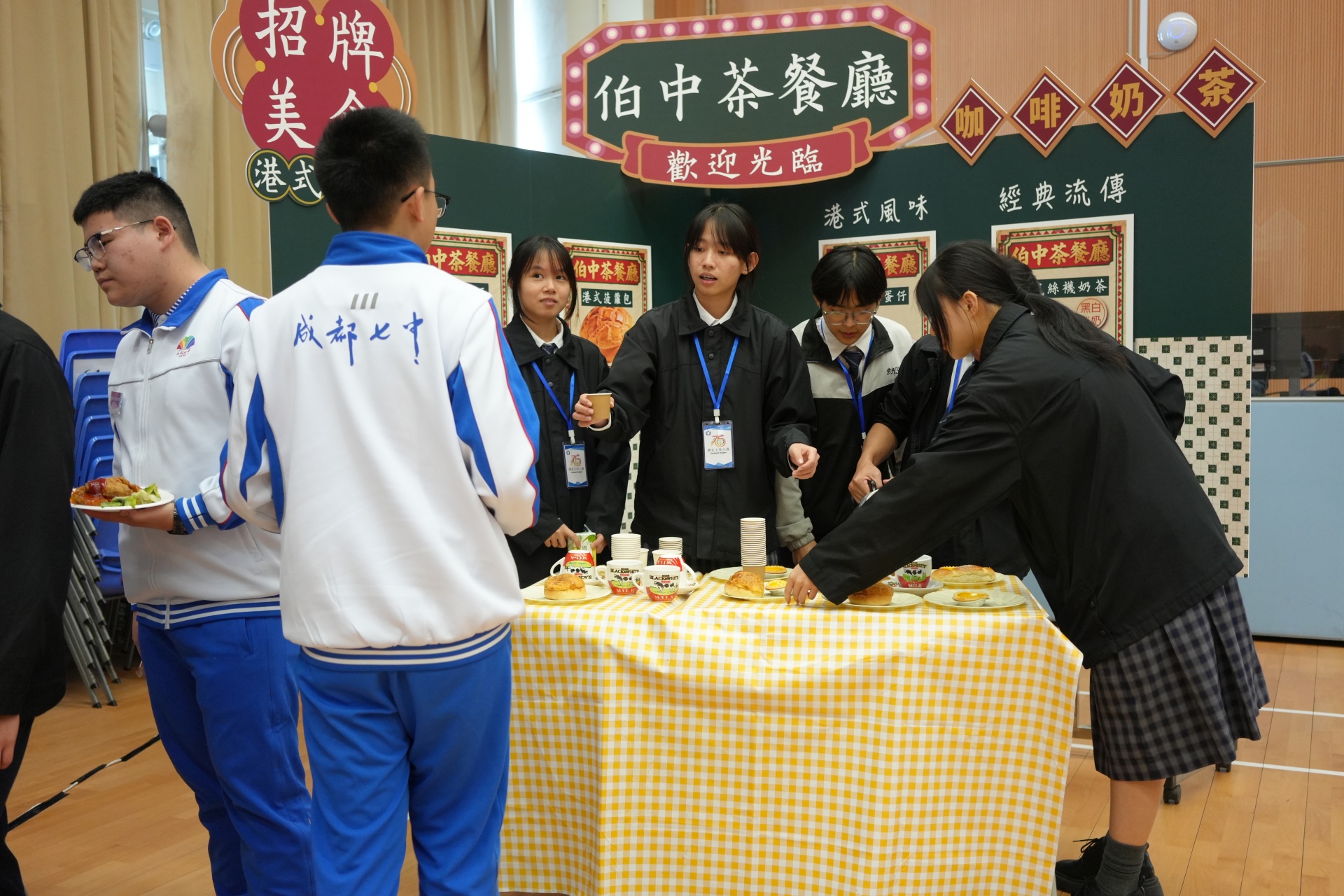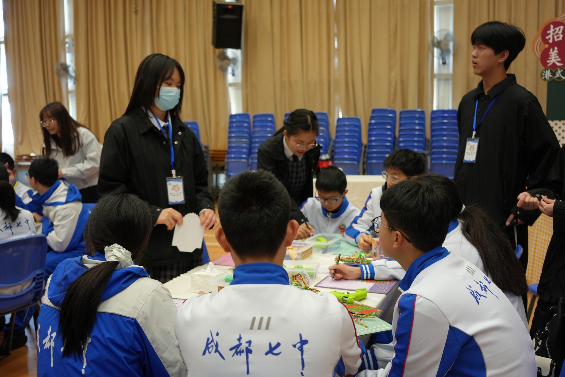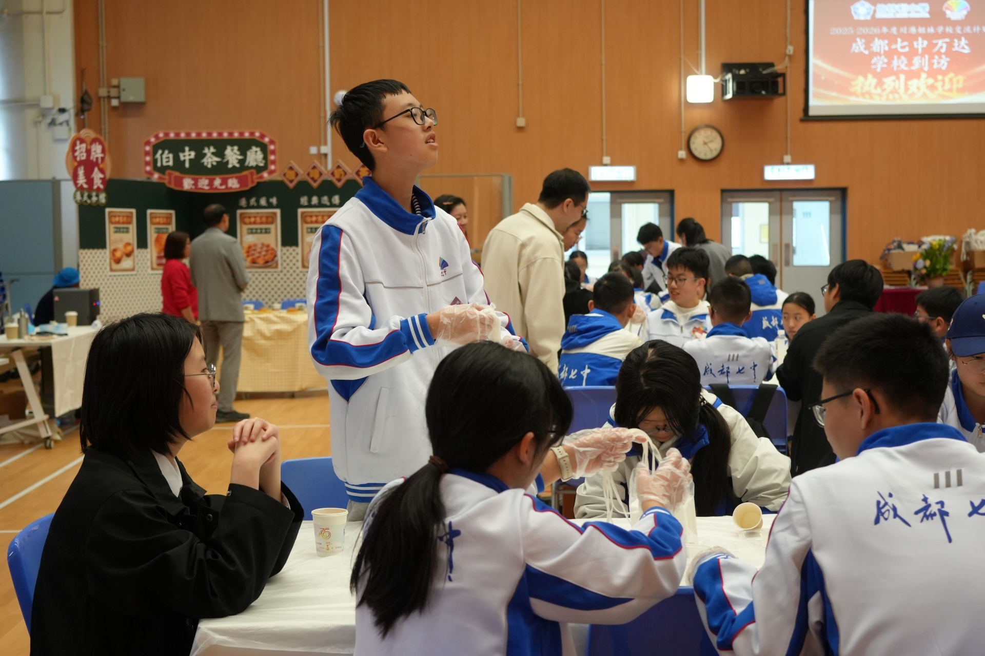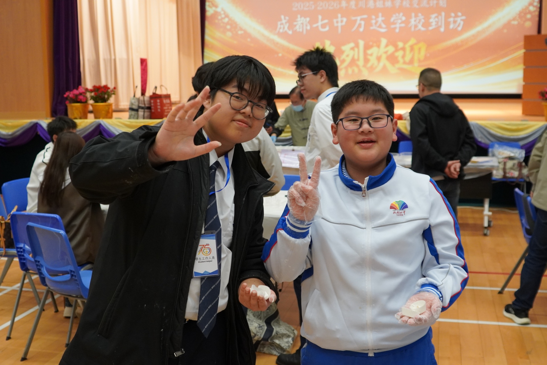 The day's activities were diverse, including the introduction of both schools about the different educational characteristics and latest developments. Students from the sister school then participated in games and activities with our student ambassadors, getting to know each other and exchanging ideas. Following this, some non-Chinese speaking students from different ethnic backgrounds participated in an interactive English learning activity, which not only helped enhance their motivation to learn English and their understanding of Hong Kong's unique characteristics but also deepened friendships and strengthened their sense of cultural integration. The teachers of sister school were able to taste the well prepared coffee from our school's coffee team and expressed their appreciation for the students' brewing skills. We also arranged two traditional handicraft workshops for them, including Mini Flower Board Crafting Workshop and Dragon Beard Candy Trial Class, so as to experience Hong Kong's traditional crafts and food production. During the lunch time, they tried some Hong Kong's specialty snacks and ethnic minority foods. Besides, our visitors from Chengdu watched the Oriental Dance performance and Pakistani folk dance, gaining a multi-faceted understanding of Hong Kong's unique characteristics and multiculturalism.