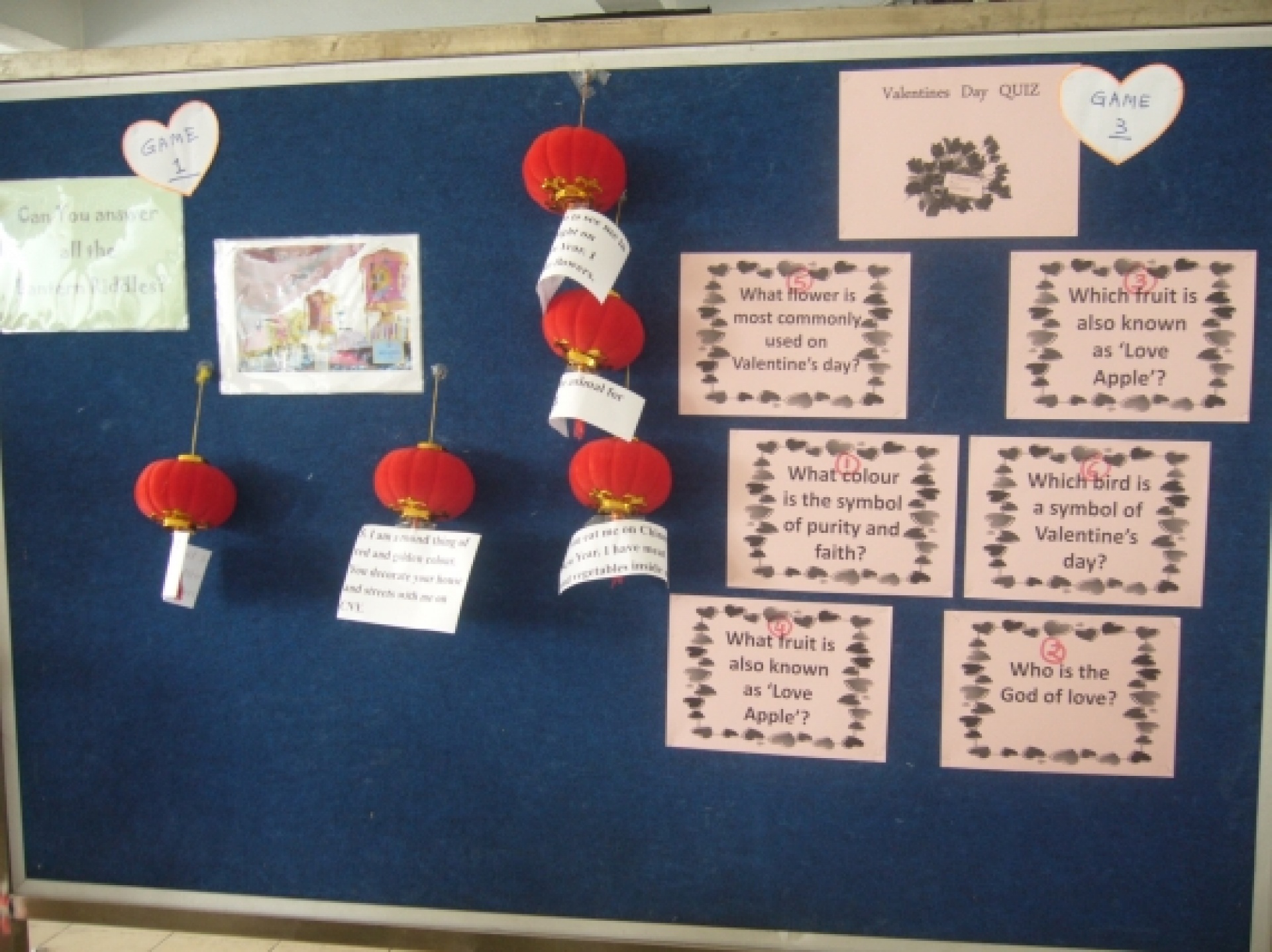 On 6th February 2013, a number of activities were organized to celebrate the Chinese New Year and Valentine’s Day. Three game booths, namely “Lantern Riddle” Game, Red Packet Lantern-making, and Valentine’s Day Quiz, were set up in the covered playground during lunchtime. While participating in the “Lantern Riddle” Game, students could learn more English vocabulary items about Chinese New Year and enhance their understanding of Chinese New Year traditions and culture. Besides, students explored their creative skills through the lantern-making activity by using red packets, while having a lot of fun. By taking part in Valentine’s Day Quiz, students got the opportunity to understand the importance of love and relationships. They also learnt about the various symbols associated with Valentine’s Day and the traditions observed in various parts of the world.