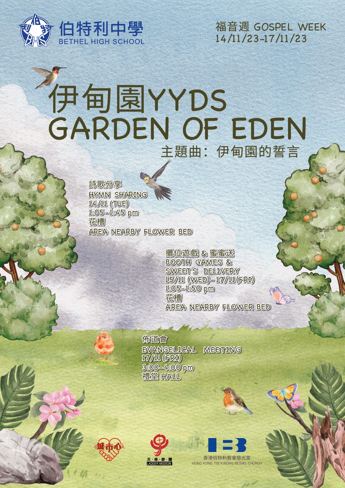 11月14至17日為一年一度的福音週,主題為「伊甸園YYDS (永遠的神)」;同學都十分享受午間活動的詩歌分享及攤位遊戲;透過信仰講座的話劇及見證分享,同學更深體會神對我們的愛及祝福,是非常寶貴及美麗。