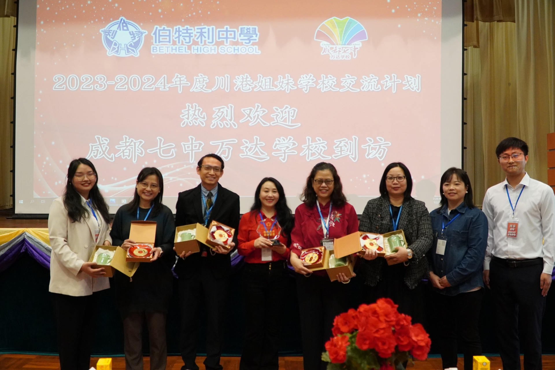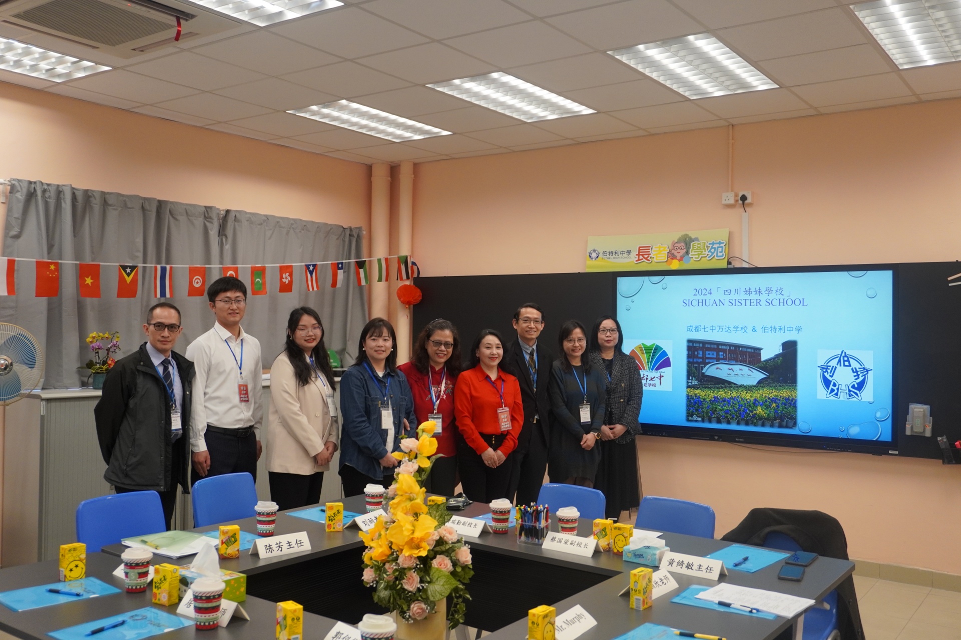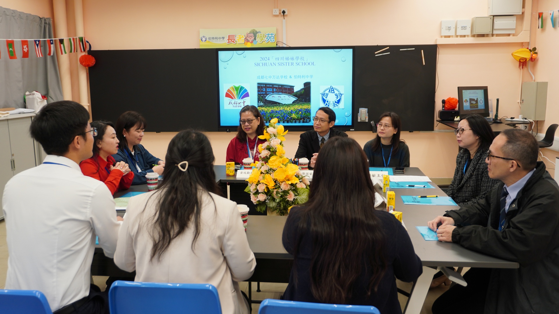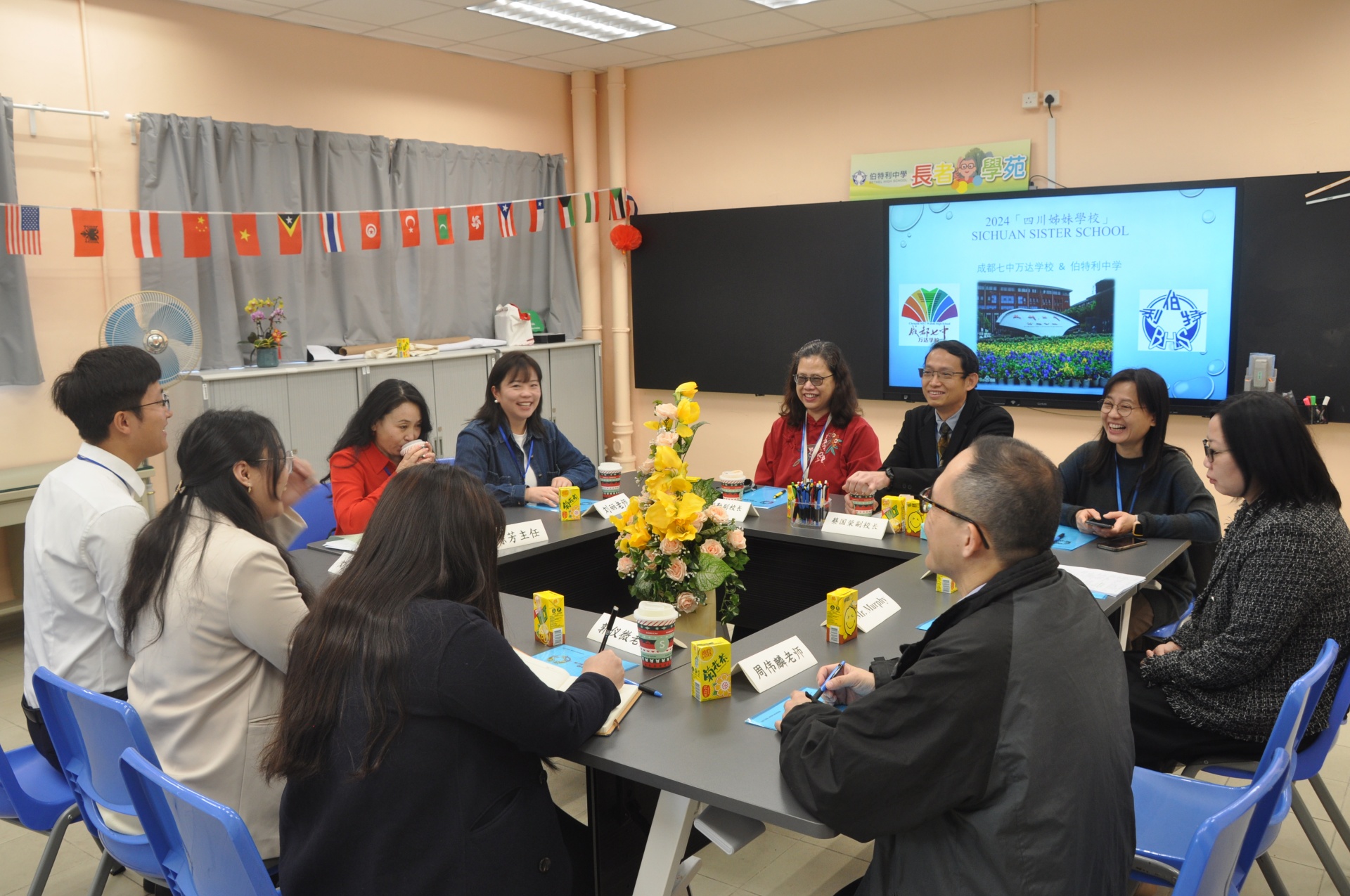 於2024年2月5日(星期一),川港姊妹學校交流計劃中之四川姊妹學校「成都七中萬達學校」到訪伯中,三十多位遠道由四川成都市來的老師及學生,參與文化交流組籌辦的交流活動,當中包括學校介紹、老師會議、姊妹學校同學互相認識及交流活動、地壺球友誼賽、校園參觀、午餐聚會、東方舞表演、參與中國文化週活動等,當日姊妹學校老師感谢本校師生的熱情款待,安排豐富及精采節目,帶給他們愉快和美好的遊學體驗。