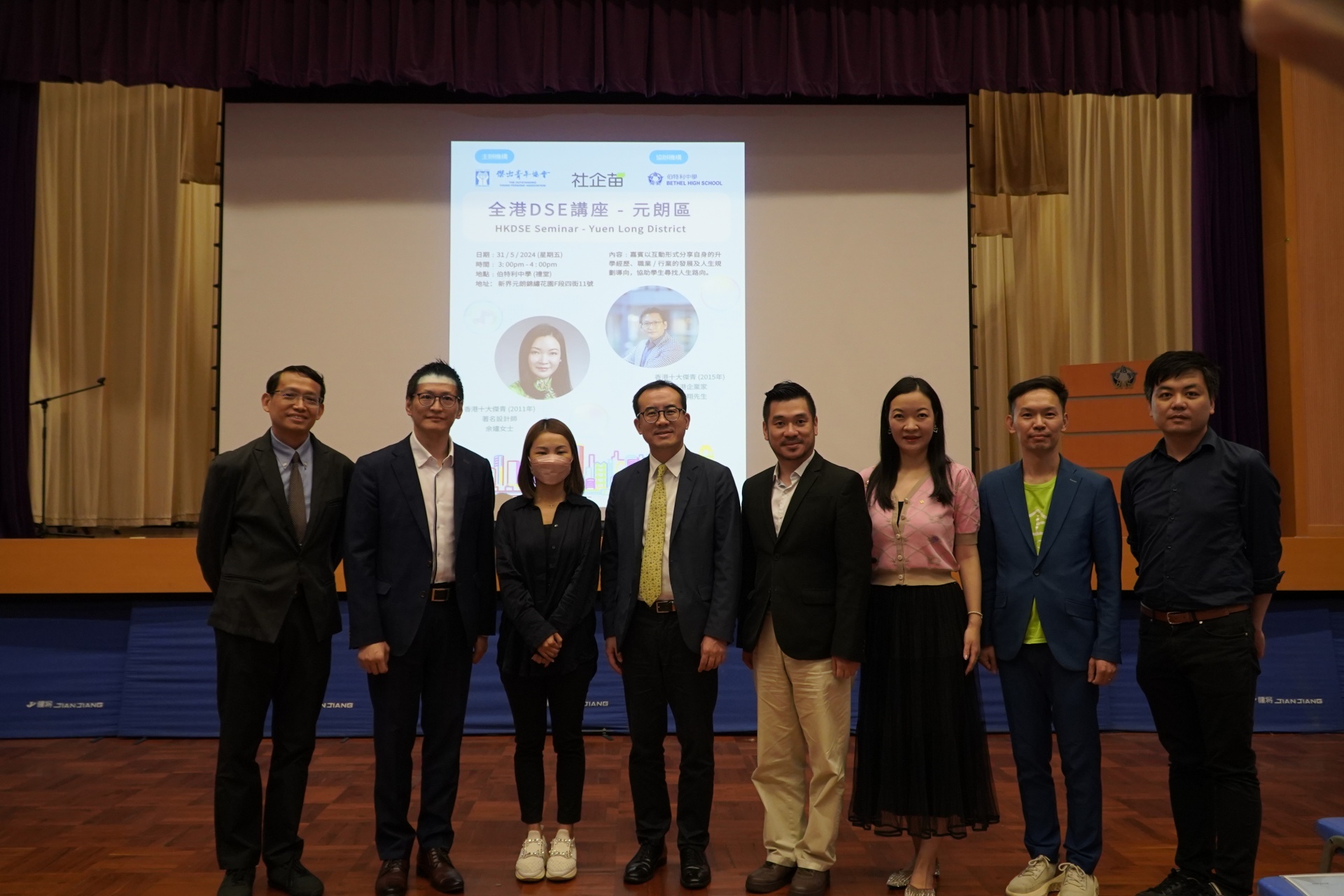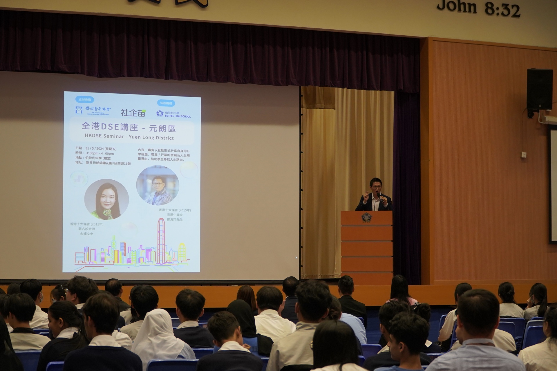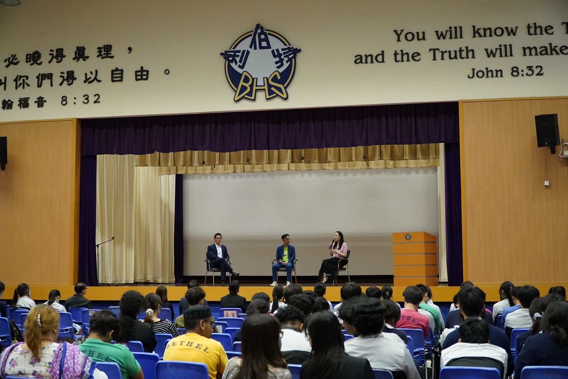 本校與香港傑出青年協會及社企苗合作,於週會時段為中四及中五同學舉行全港DSE集氣講座- 人生/職涯規劃,邀請香港十大傑青(2011)時裝設計師余嫿女士、香港十大傑青(2015)企業家鄺海翔先生擔任演講嘉賓,兩位嘉賓透過分享其自身經歷,以及專業知識,勉勵同學須以積極奮進的態度,與時並進的精神,迎接將來在職涯遇上之挑戰。