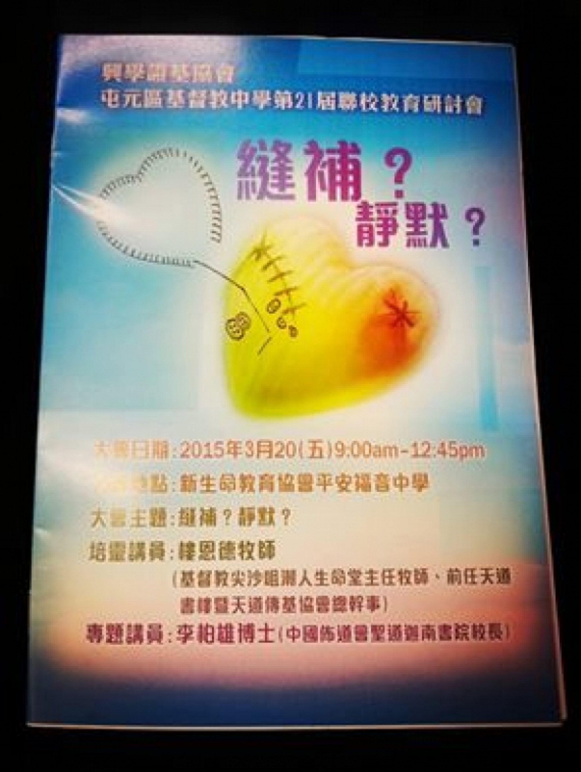 本校致力造就師生靈命成長,本年度安排全體教師於3月20日參加第21屆「屯元區基督教中學聯校教育研討會」。是次大會主題為「縫補?靜默?」,由基督教尖沙咀潮人生命堂主任樓恩德牧師作培靈分享,並請來聖道迦南書院校長李柏雄博士以「與你同行」為題作專題分享,出入學術著作與教育現場之間,最後以司徒德牧師的遺著《世界在等待的門徒》,勉勵與會老師重尋價值。