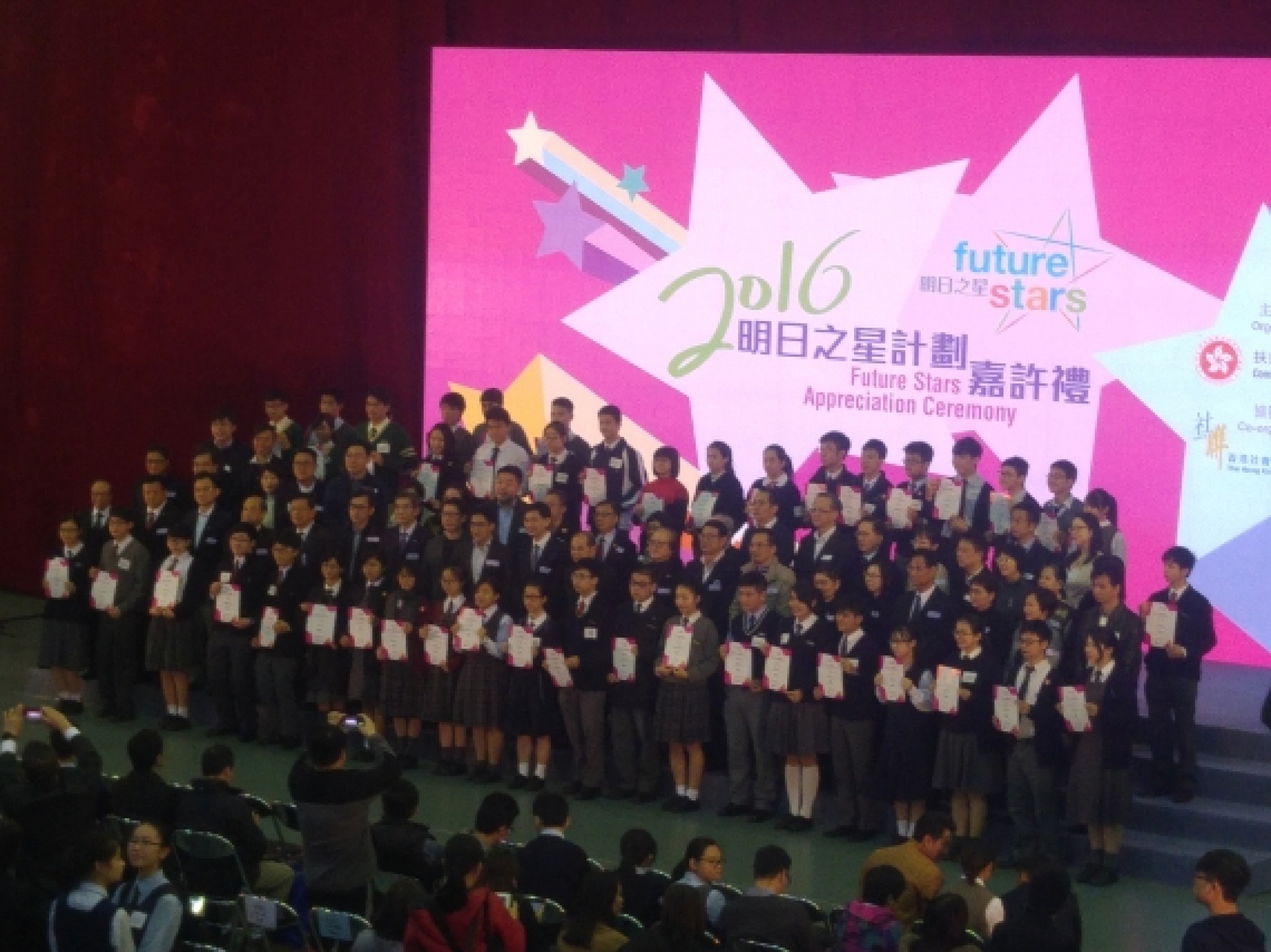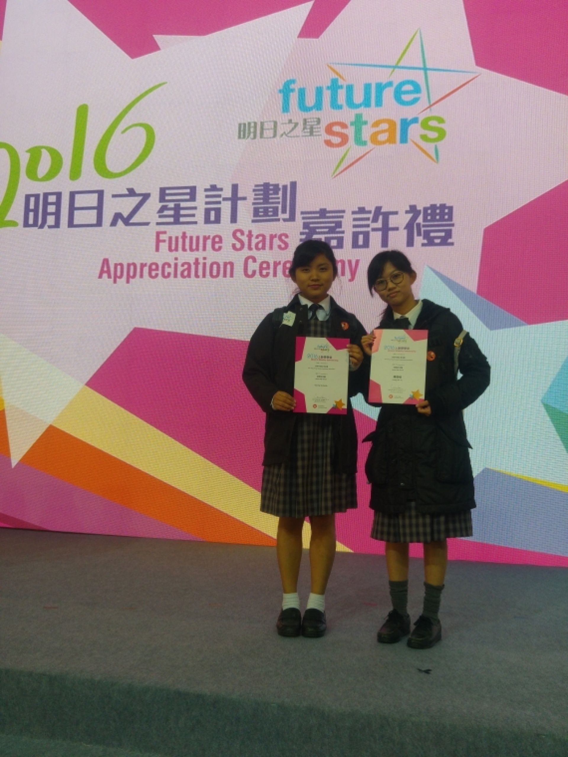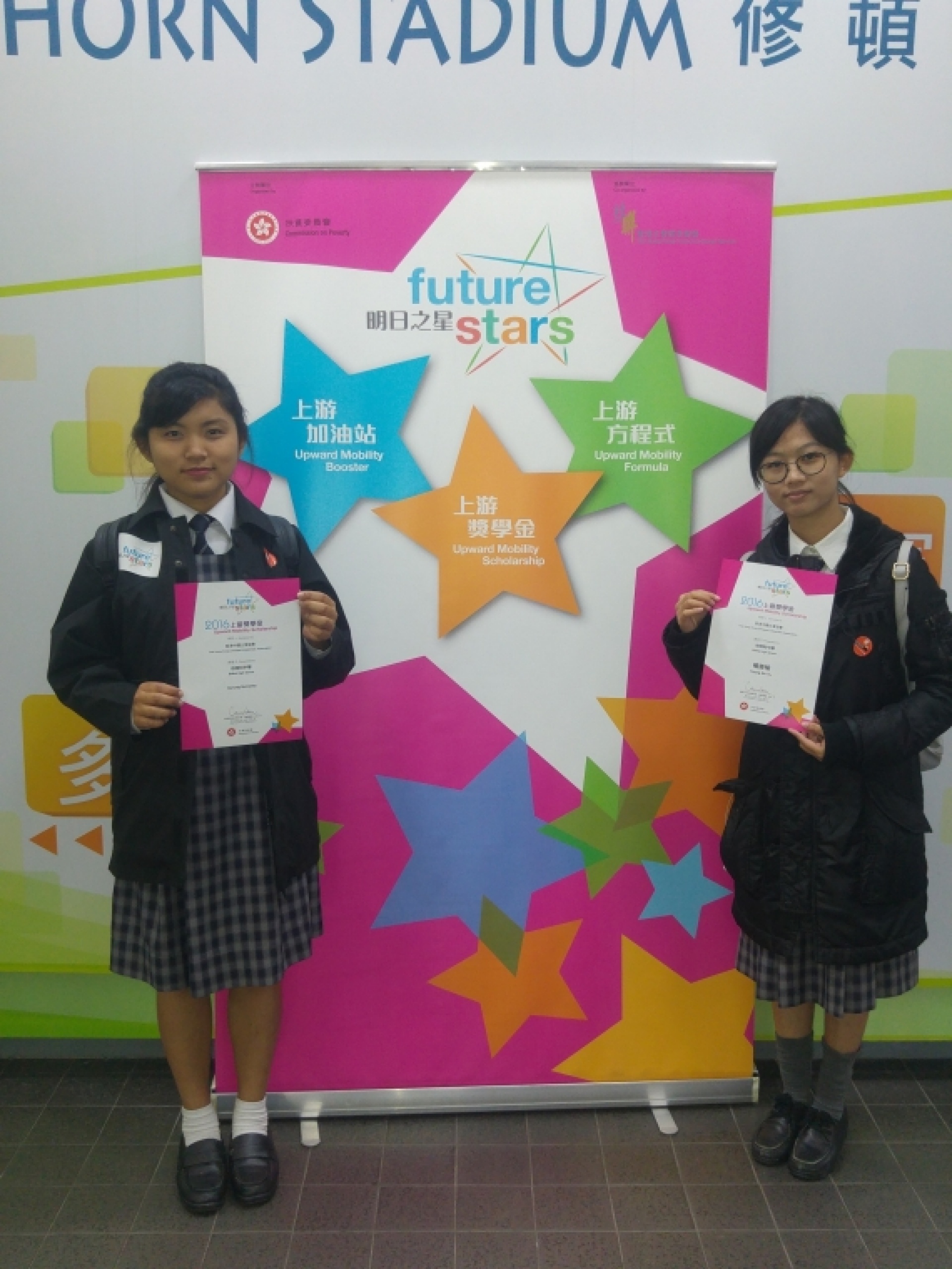 中六級楊善榆及Gurung Sumenta出席2017年1月21日「明日之星」計劃嘉許禮。她們獲獎助機構頒發獎狀及「上游獎學金」,鼓勵她們力爭上游,追尋夢想。