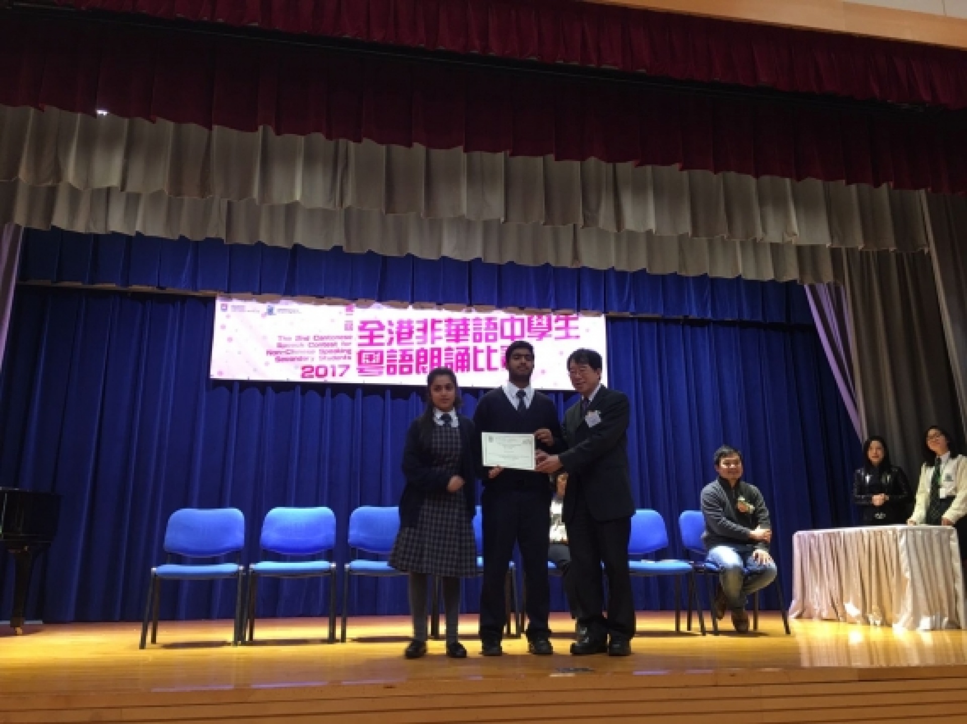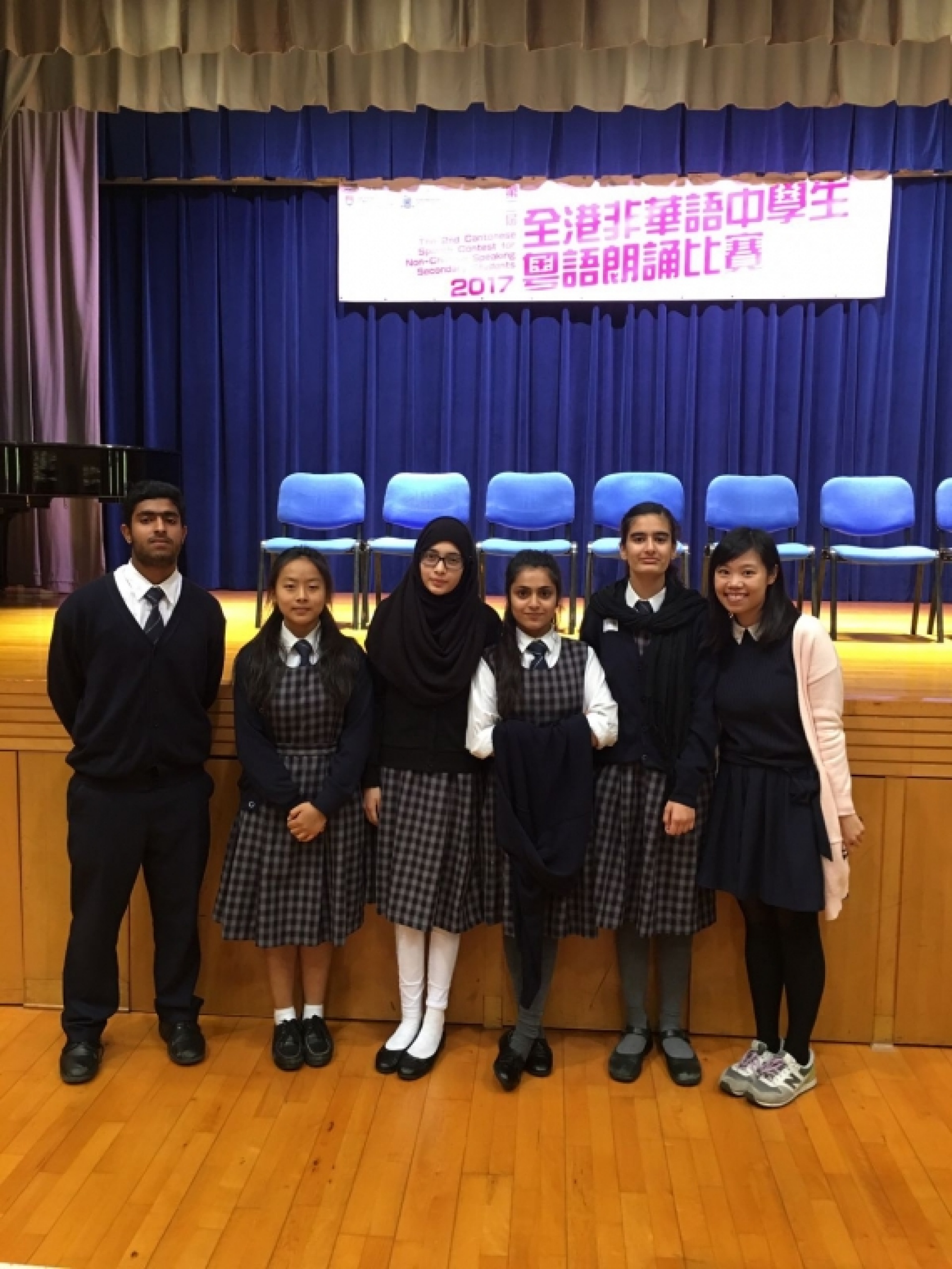 2B HASSAN-AHMAD, 3B 3B DURA JASMINA, 3B TAHIR AQSA, 3B BIBI JAWAIRIA和5A FARAZ SUNNAH於11-3-2017參加了由香港大學教育學院中文教育研究中心舉辦的第二屆全港非華語中學生粵語朗誦比賽。2B HASSAN-AHMAD and 3B TAHIR AQSA 二人獲得新詩合誦優異獎。