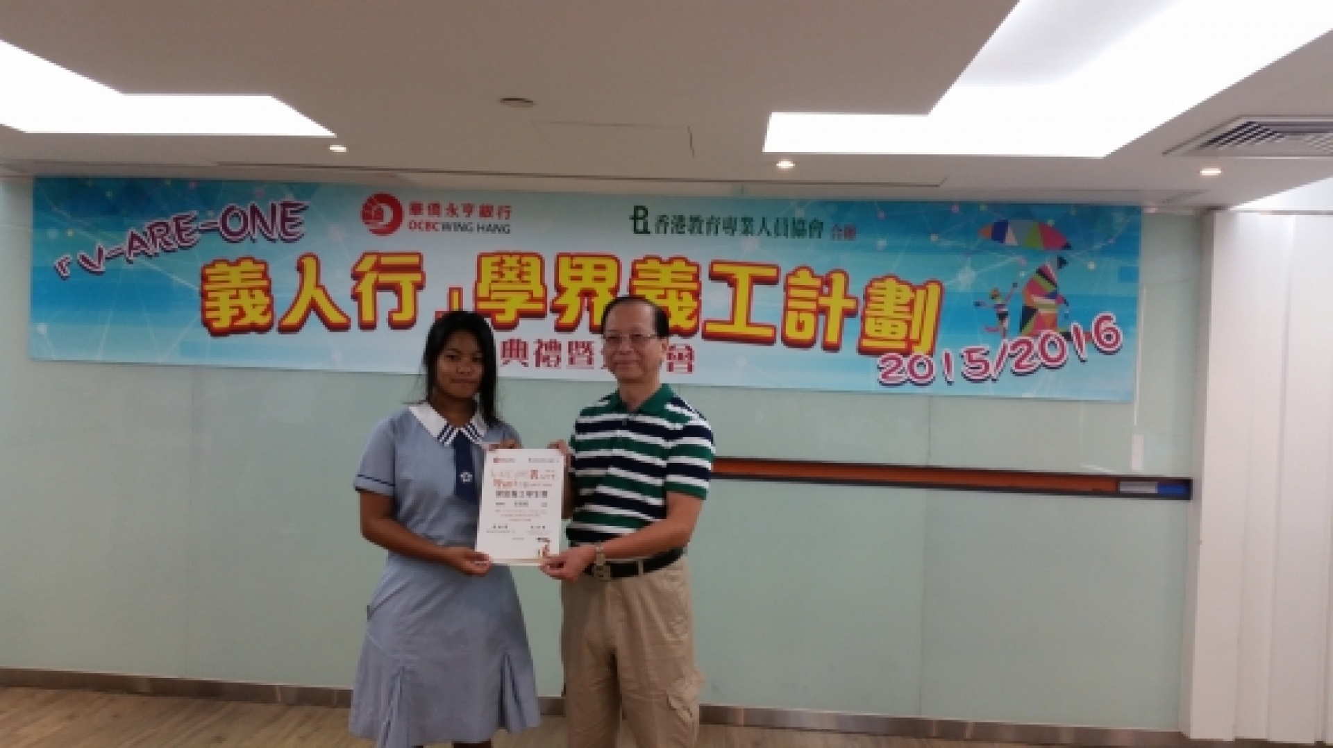 2B DURA JASMINA,2B THAPA BED KUMARI,參加華僑永亨銀行及香港教育專業人員協會合辦「V-ARE-ONE 義人行」學界義工計劃,獲得傑出義工學生獎。