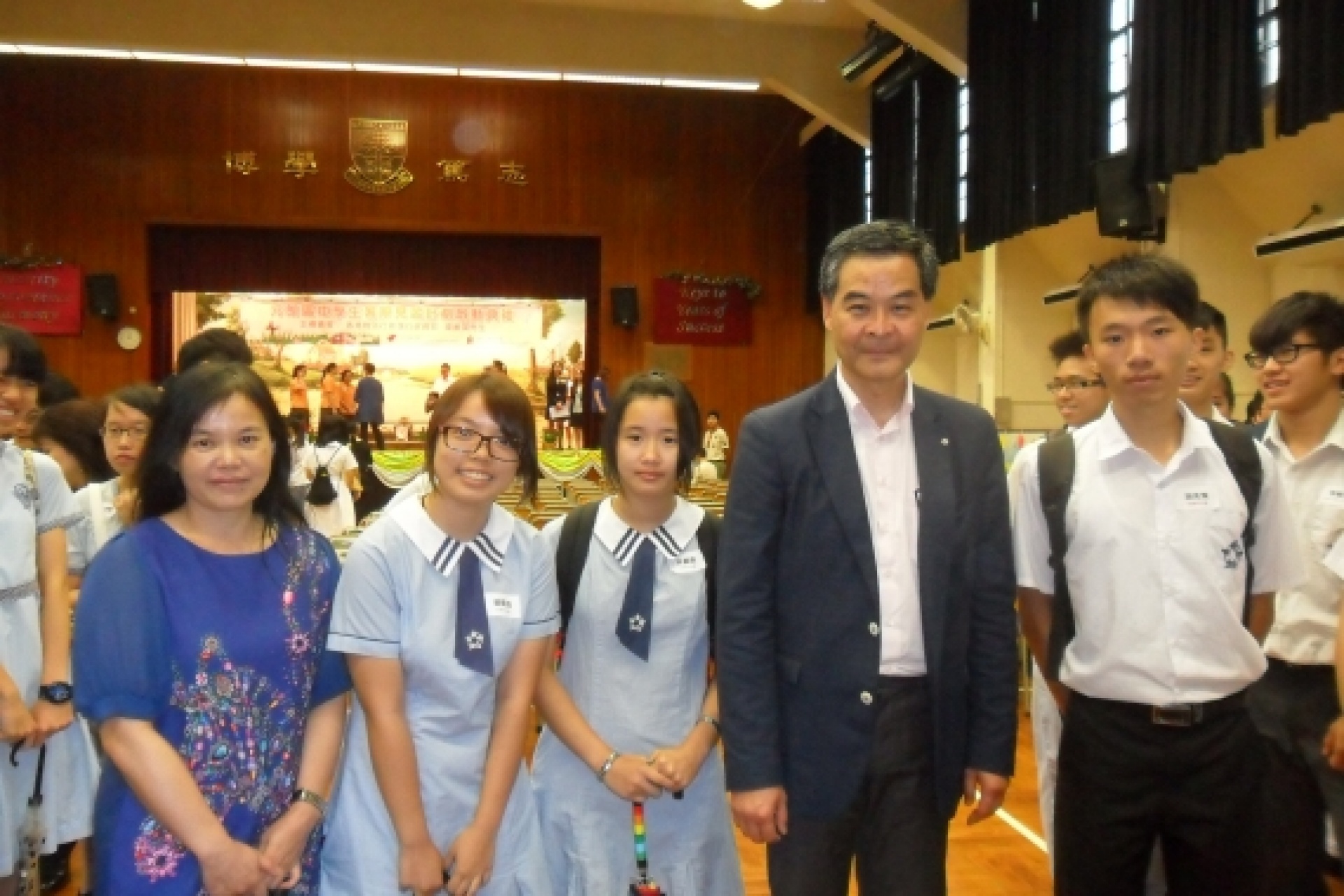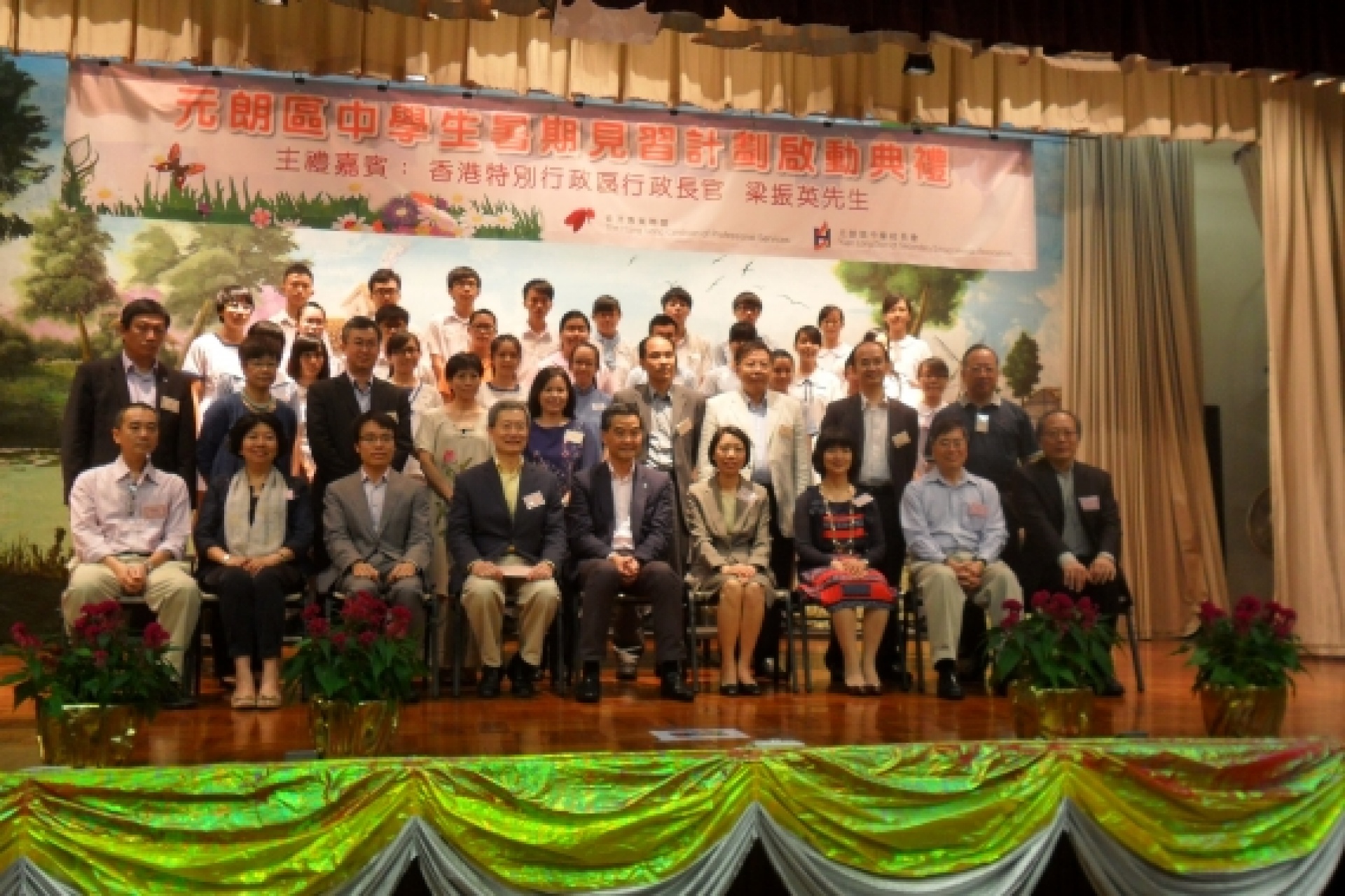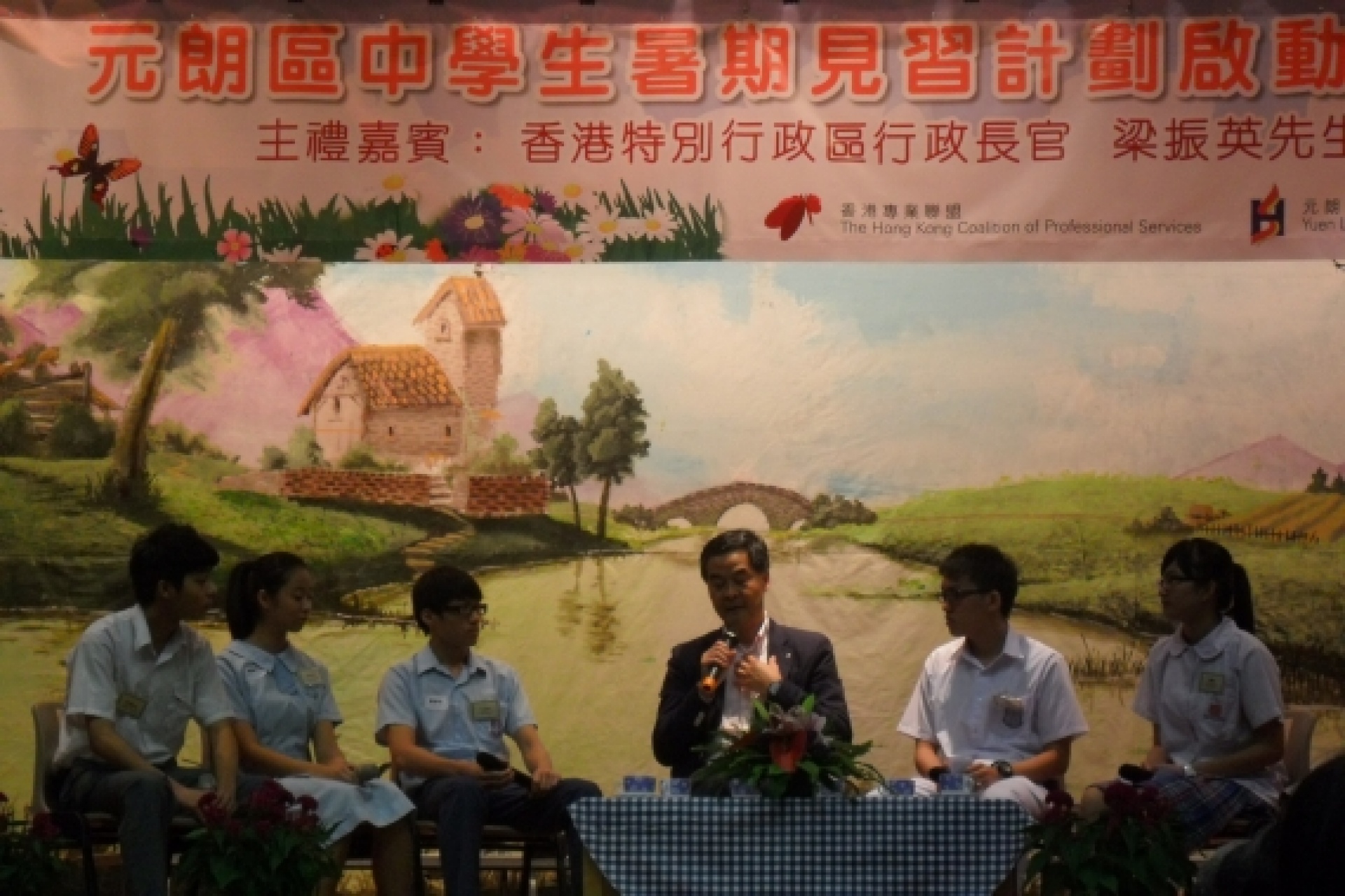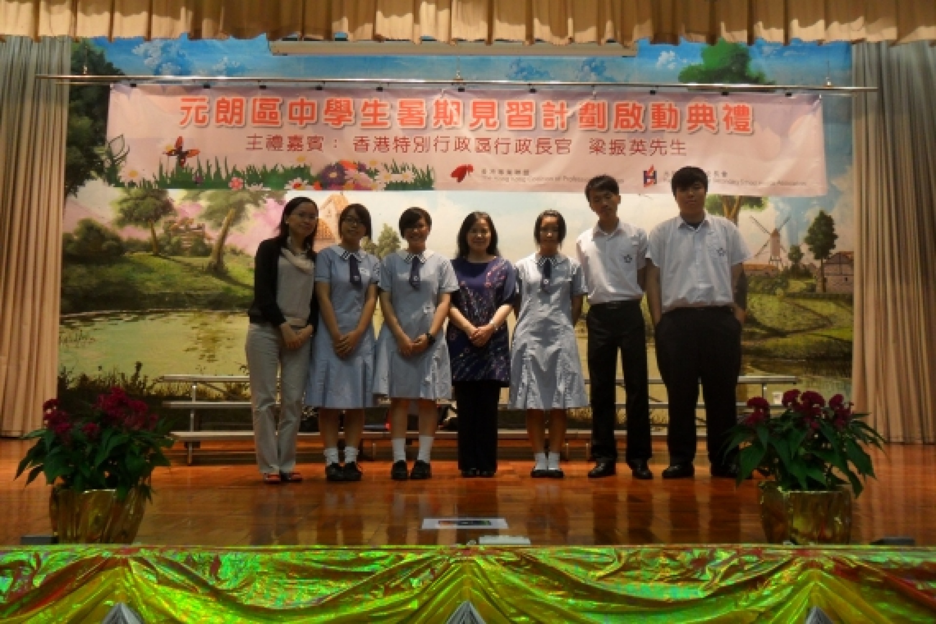 香港專業聯盟梁振英主席及元朗區中學校長會為本屆中五同學設計了一個「元朗區中學生暑期見習計劃」。本校推薦了5位同學參加,讓他們到不同專業的事務所見習兩星期,以增力工作體驗,拓闊視野。參加學生出席6月22日啟動禮,由行政長官梁振英先生主禮。梁振英先生與一百七十多名參加計劃的中五學生座談, 鼓勵他們努力自強。