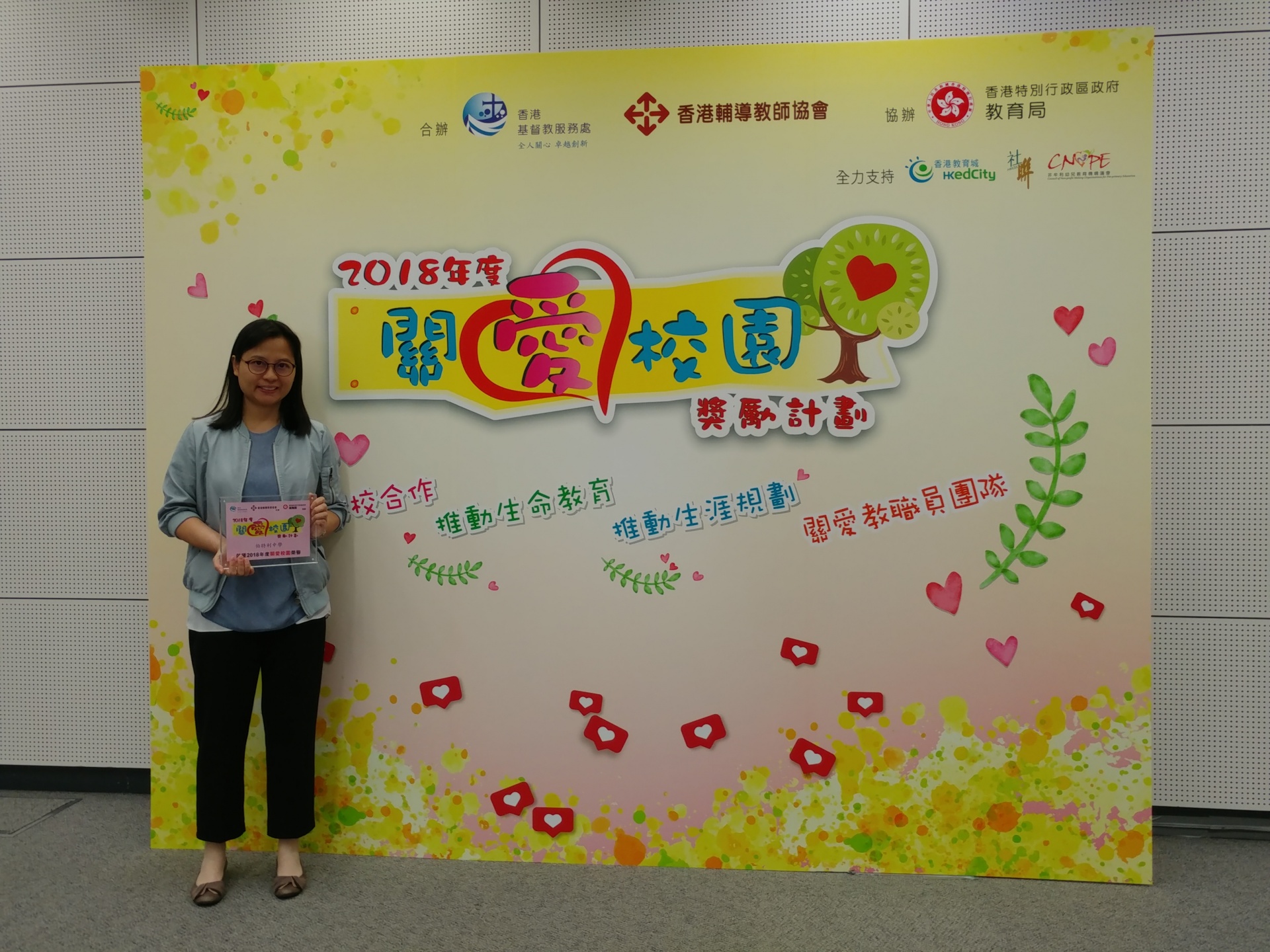 由香港基督教服務處(Hong Kong Christian Service)主辦、香港輔導教師協會、香港教育城及教育局協辦之2018年度關愛校園獎勵計劃。本校榮獲「關愛校園」榮譽獎項。