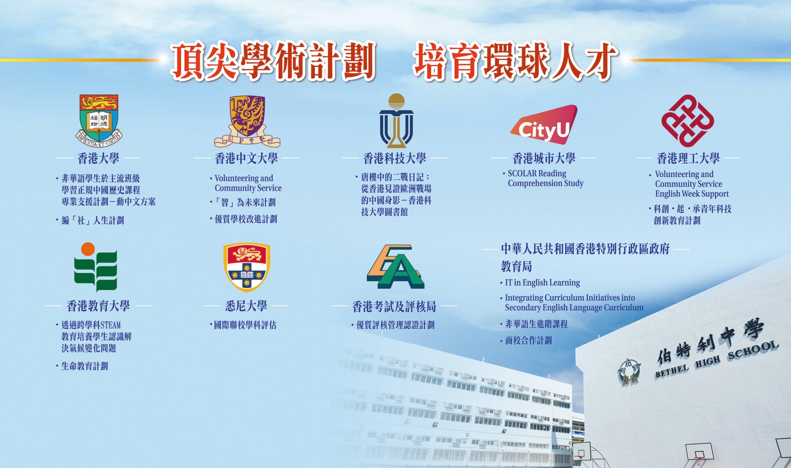 伯特利中學積極與全球頂尖學府及機構合作,為學生提供豐富多元的學習機會。