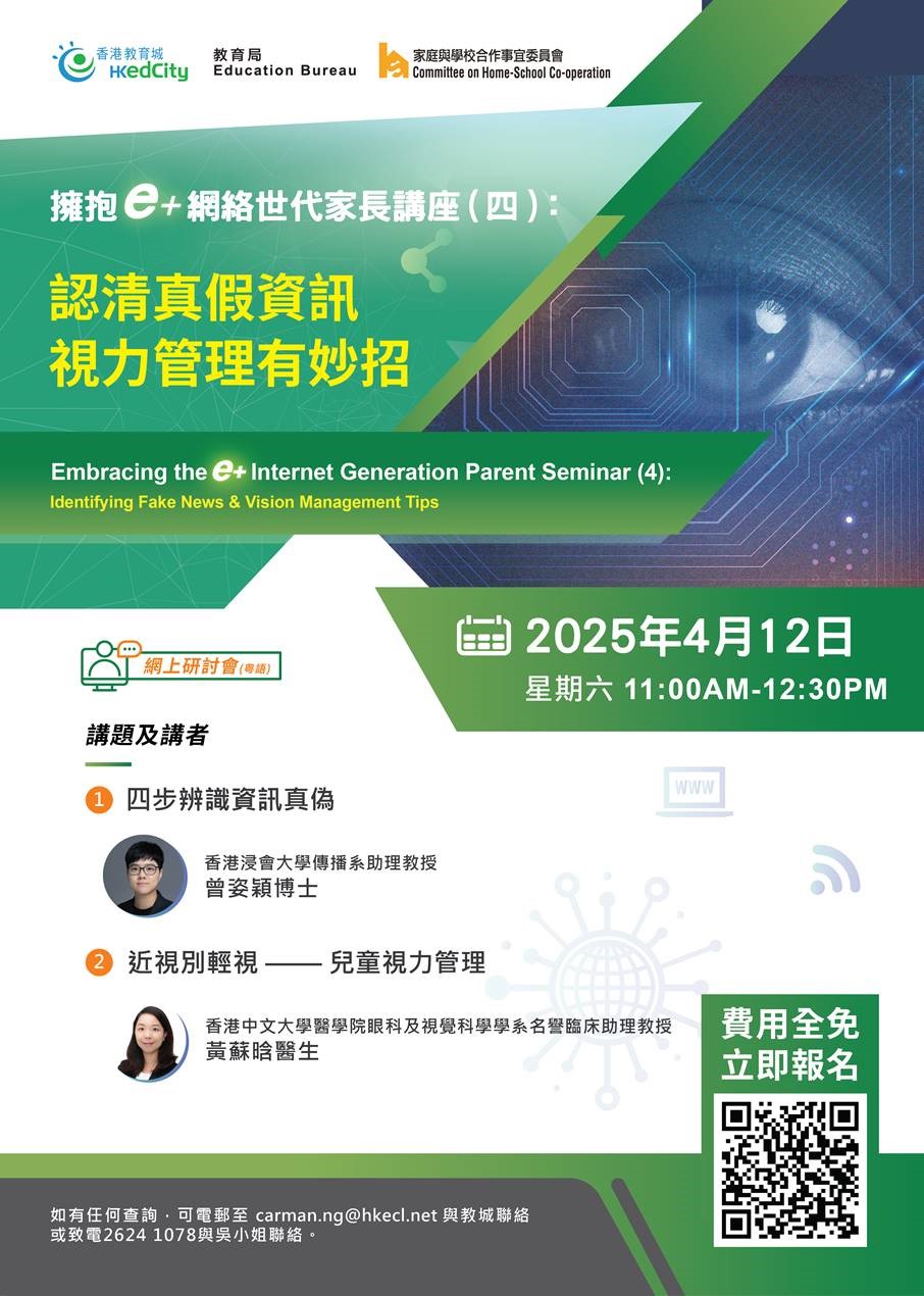 教育局將聯同香港教育城、家庭與學校合作事宜委員會合辦「擁抱e+網絡世代」家長講座(四)︰認清真假資訊X 視力管理有妙招將於2025年4月12日(星期六)上午11時正至下午12時30分以網上講座形式進行,現已接受報名(截止報名日期: 2025年4月11日下午5時正)。