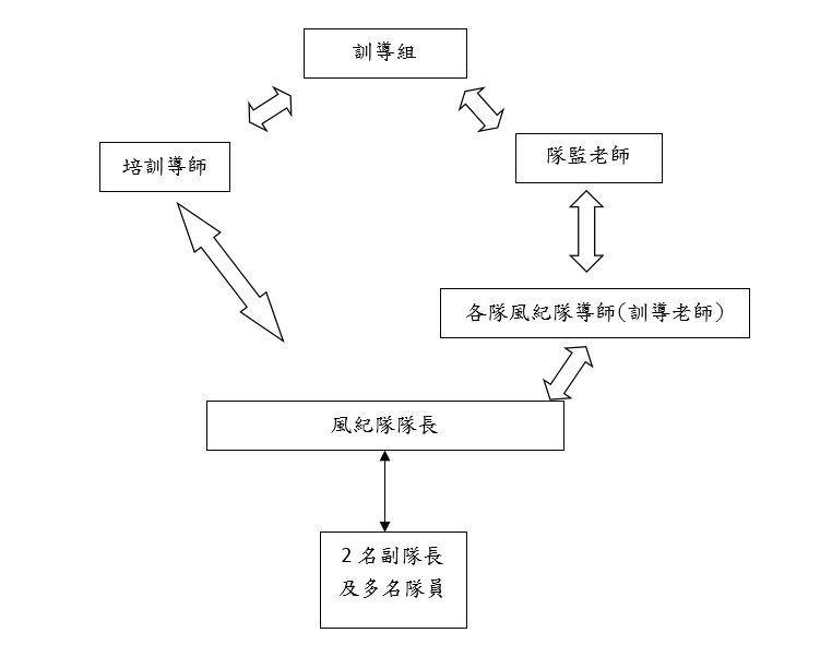 - 風紀隊設兩名總隊長(即隊長),負責協助老師管理及執行全體的工作。另外,每組設風紀副隊長兩名,其餘則為資深隊員或隊員。