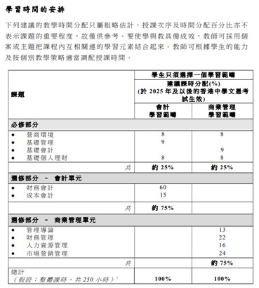 本課程因應本地及環球社會與經濟急速變遷的需要,以當代商業課程結構為發展基礎而編排,內容包括各商業有關科目的知識(如會計、企業管理及財務),並突出其複雜及互相緊扣的關係。本課程的學習元素充分反映現實商業世界千絲萬縷的複雜關係。